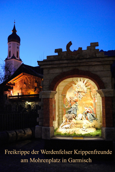 Sie finden unsere Freikrippe mit Ausnahme der Krippenzeit im Museum Aschenbrenner und vom ersten Advent bis "Maria Lichtmeß" am Mohrenplatz beim "Polzn-Kaspar-Haus" in der Nähe der Garmischer Pfarrkirche St. Martin.